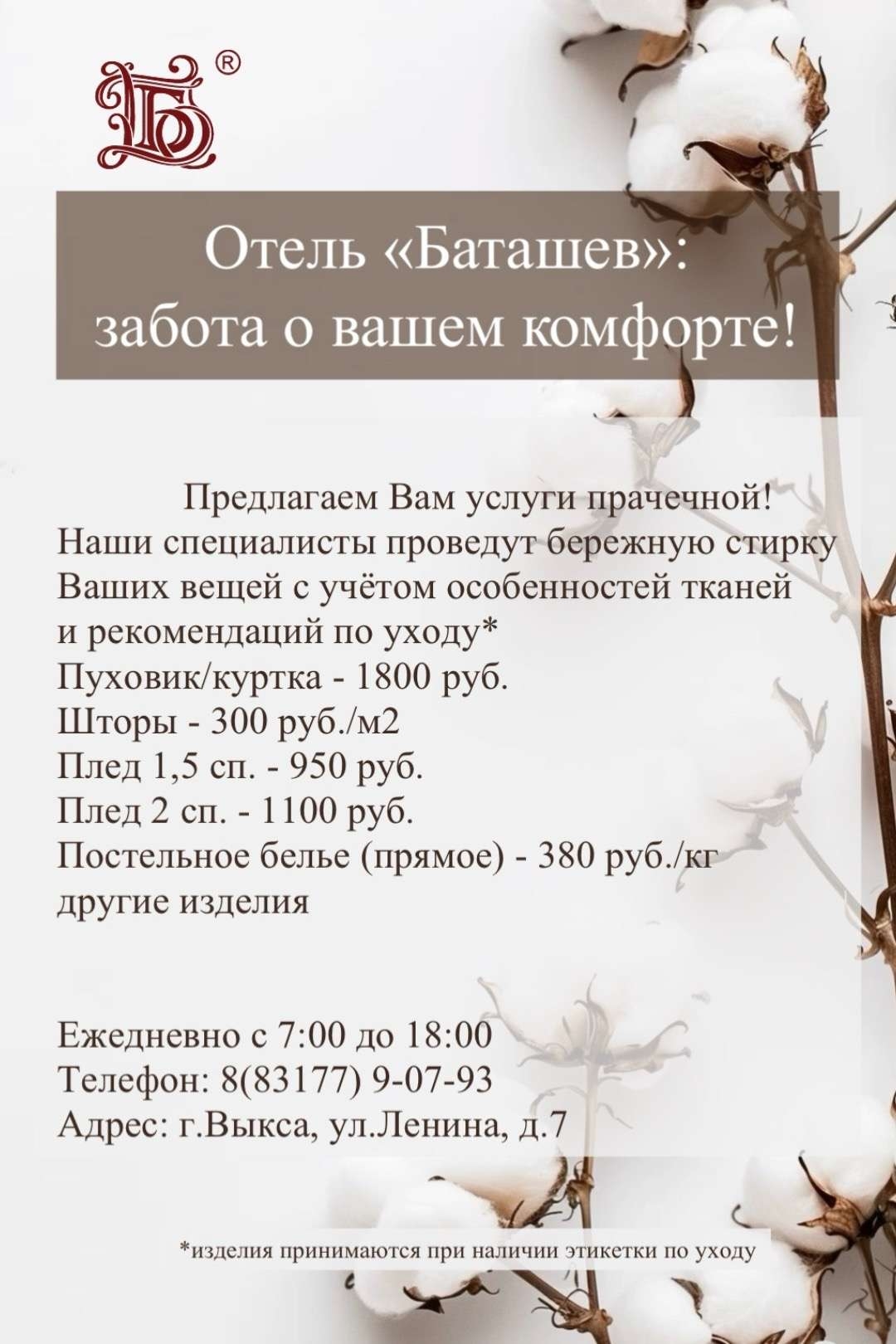 Услуги прачечной в гостинице Баташев!